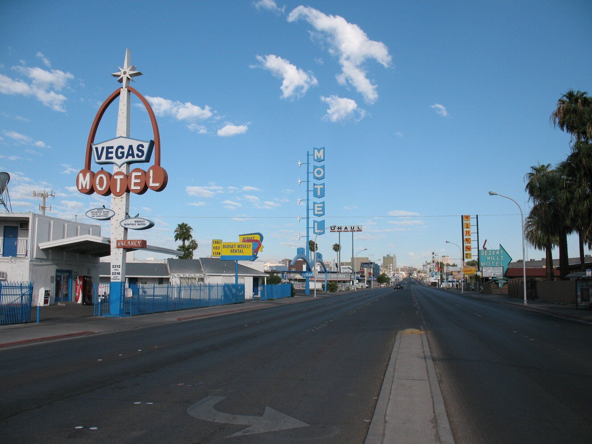 Las Vegas was an important stop for automobile travelers. There were two main routes through Las Vegas. Highway 91 cut across Southern Nevada in a south-to-north trajectory. Once it crossed Fremont Street, it became the Arrowhead highway. The other way to Las Vegas was across Route 66 to Kingman, Arizona, then north crossing Hoover Dam, dropping down to the Boulder Highway and on to Fremont Street. Travelers who braved the heat and the wind to arrive at their destination were accommodated in small motels around Las Vegas. Along East Fremont street, on South and North Las Vegas Blvd, and downtown, blocks of independently-owned mom-and-pop motels sprang up.